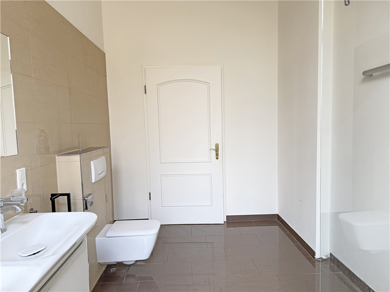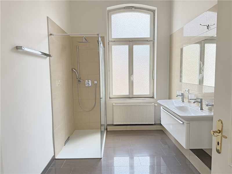 Badezimmer mit bodengleicher Dusche, Waschtisch, WC und Fenster. Kabel-TV möglich.