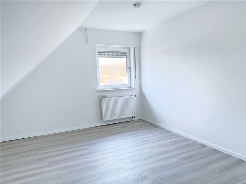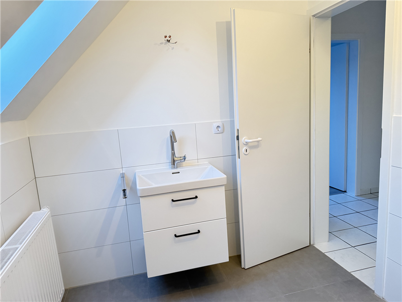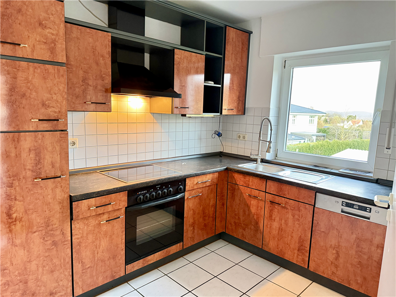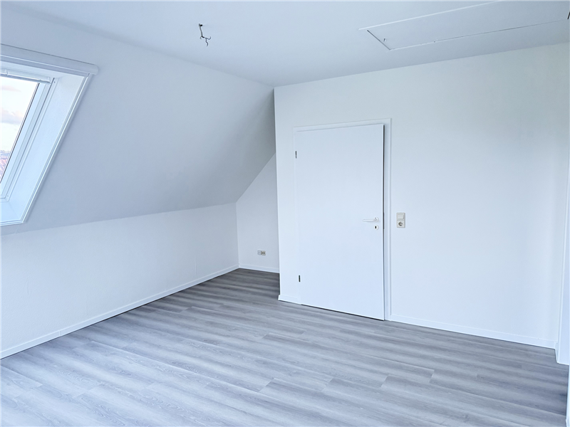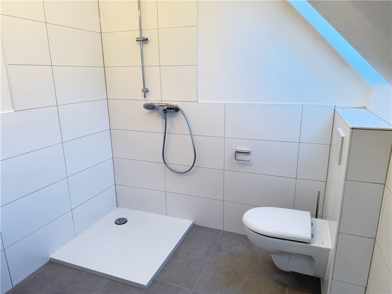 Neues Badezimmer mit Dusche, Waschbecken, WC und 2 Dachflächenfenstern. Küche und Flurbereich mit weißen Fliesenboden, Badezimmer mit neuen Fliesen, alle anderen Räume mit neuem Laminatboden. Kabel-TV möglich. Sonnige Süd-/Ostloggia. Einbauküche inkl. E-Geräte.