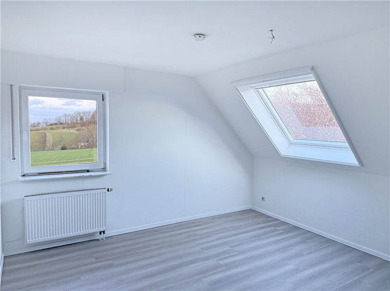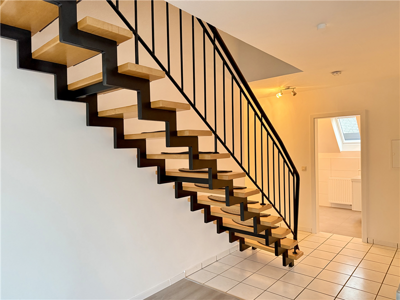 Offene Holztreppe zum Dachgeschoss. Ein heller Raum mit 2 Fenstern (Durchgangszimmer), ein weiterer Raum.