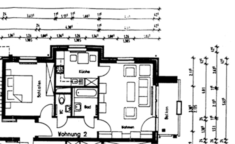 Wohnzimmer mit Balkon, Schlafzimmer, Küche, Badezimmer, sep. WC und Flur.