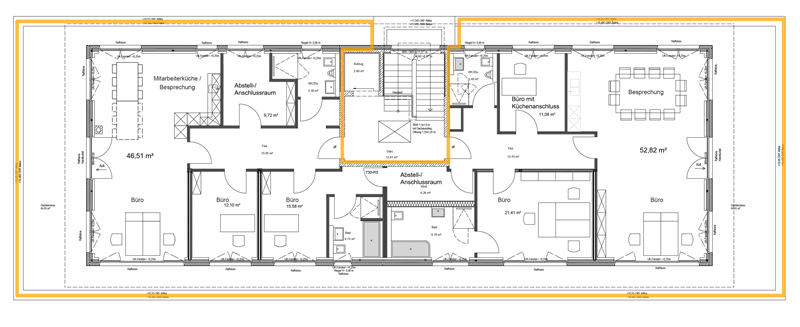 Flur, 2 großzügige und helle Büroflächen je mit Anschlüssen für eine Küche (Abtrennung/Aufteilung zu 3-4 Räumen möglich), 4 weitere Büroräume (einer davon ebenfalls mit Anschlüssen für eine Küche, 2 Räume davon mit anliegenden Bädern), 2 weitere Duschbäder mit Fenster auf den Fluren, 2 Anschluss-/Abstellräume.
