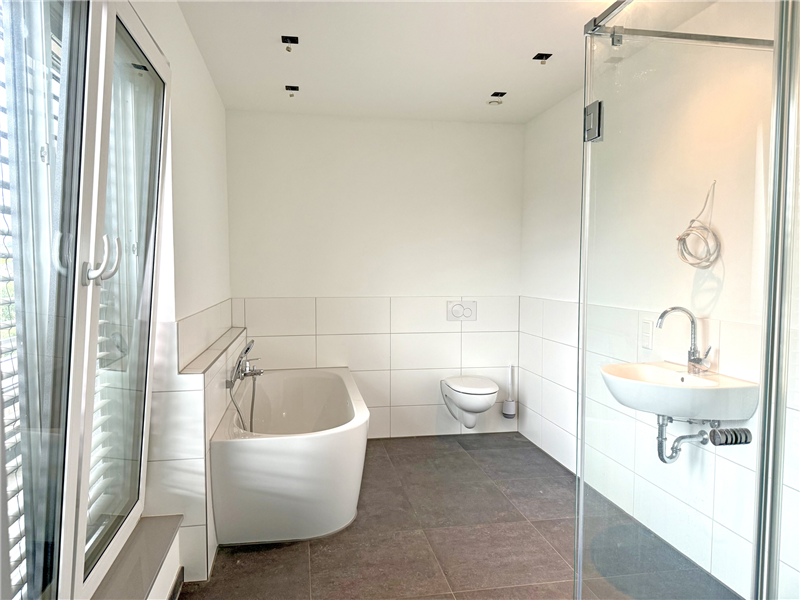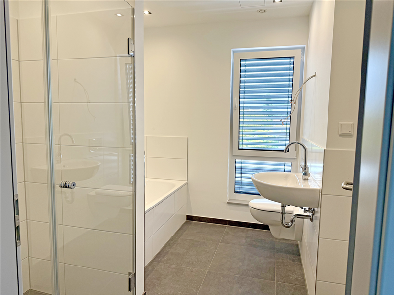 Sep. abrechenbare Wärmepumpe. Alle Räume mit Fußbodenheizung und Netzwerkverkabelung. Große Fenster mit Raffstoren in allen Räumen. Wände und Decken glatt, weiß gestrichen. Deckenspots. Alle Räume mit Fliesenboden, weiße Innentüren.