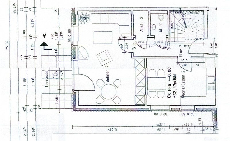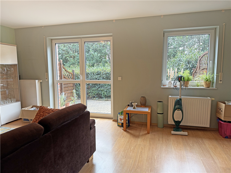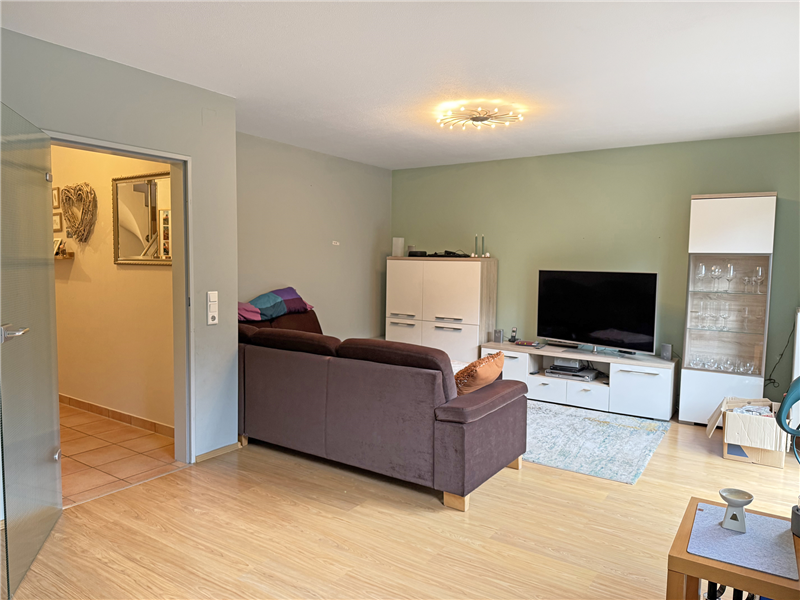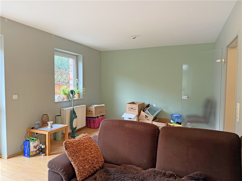 Flur/Eingangsbereich, helle Wohnküche, Gäste-WC, Abstellraum und helles Wohn-/Esszimmer mit Zugang zur Terrasse (Süd-/Westausrichtung).