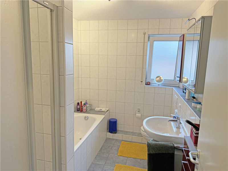 Gaszentralheizung mit Warmwasseraufbereitung, sep. Wasseruhr. Weiße Kunststofffenster mit Isolierverglasung und Rollläden. Wände und Decken mit Raufasertapete neu-weiß gestrichen. Weiß gefliestes Badezimmer mit Dusche, Wanne, Waschbecken, WC und Fenster, Gäste-WC mit WC, Waschbecken und Abluftanlage.