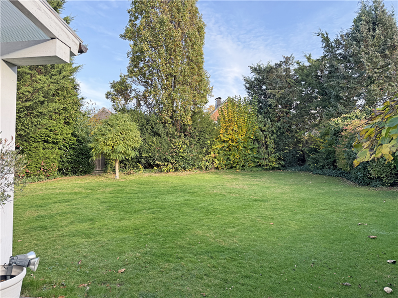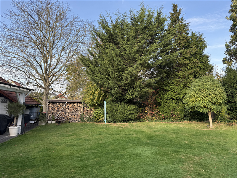 Idyllisch angelegter und eingezäunter Garten mit Rasenfläche und Grenzbepflanzungen (uneinsichtig). 2 überdachte Terrassen mit Blick in den Garten.