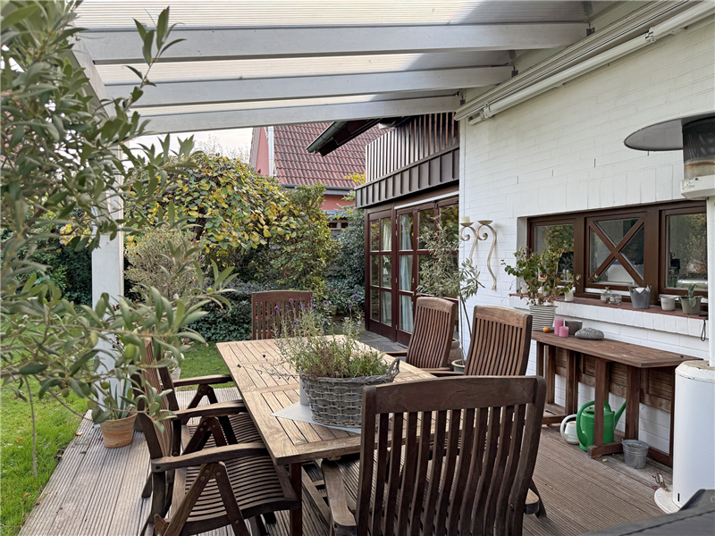 Große überdachte Terrasse Richtung Osten mit Markise. Weitere überdachte Terrasse Richtung Westen.