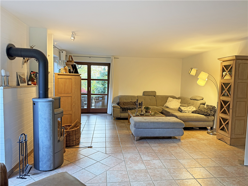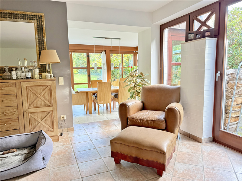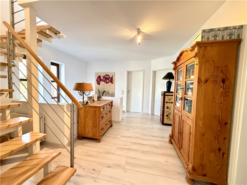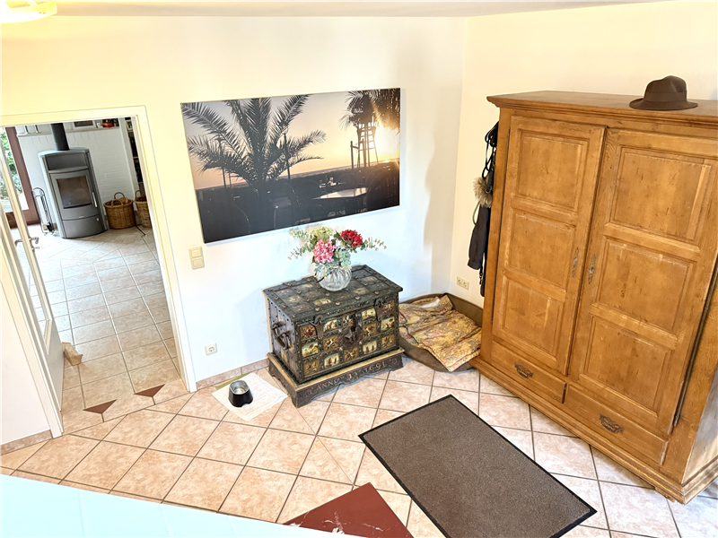 Heller, großzügiger Flur/Eingangsbereich mit Steintreppe. Offener Wohn-/Ess-/Kochbereich mit Einbauküche, Kaminofen und Wintergarten/Essbereich (mit Zugang zum Garten). Modernes Duschbad mit Tageslicht, Vorratsraum mit Fenster, dahinter liegt der Heizungsraum. Waschraum mit Einbauschränken und Zugang zum Garten/Terrasse, kleiner Abstellraum unter der Treppe.