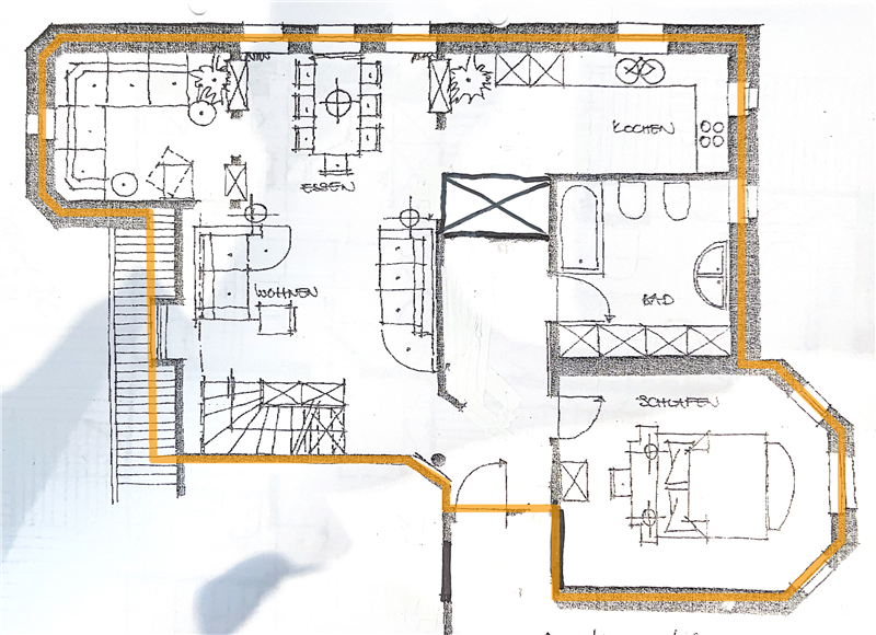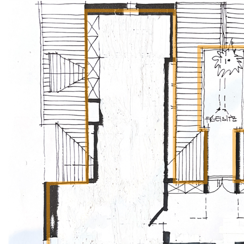 Eingangsbereich mit Garderobe, Bad, Schlafbereich, großes und helles Wohn-/Esszimmer mit offener Küche, Lesebereich und Zugang zum Dachgeschoss über eine offene Holztreppe. Im Dachgeschoss befinden sich ein heller offener Arbeitsbereich/Jugendzimmer, ein Bad mit Eckduschwanne und ein kleiner Flur mit Zugang zur Dachterrasse (Ausrichtung Süd/Ost).