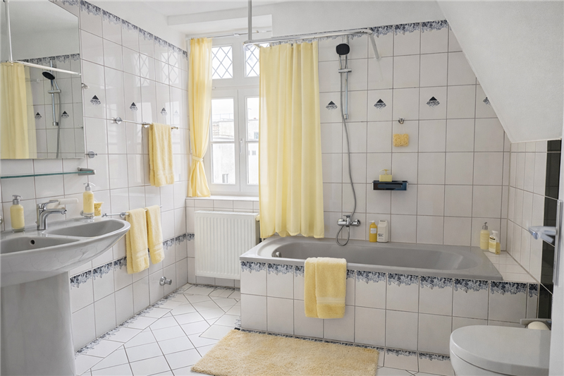 Gasheizung mit Warmwasseraufbereitung, separate Zähler. Holzfenster mit Isolierverglasung. Bad im 2. OG mit Duschwanne, Doppelwaschbecken, WC und Fenster, Bad im Dachgeschoss mit Duscheckwanne, Waschbecken, Spiegelschrank, WC und Dachflächenfenster (Bäder mit neuen WCs und neuen Armaturen).