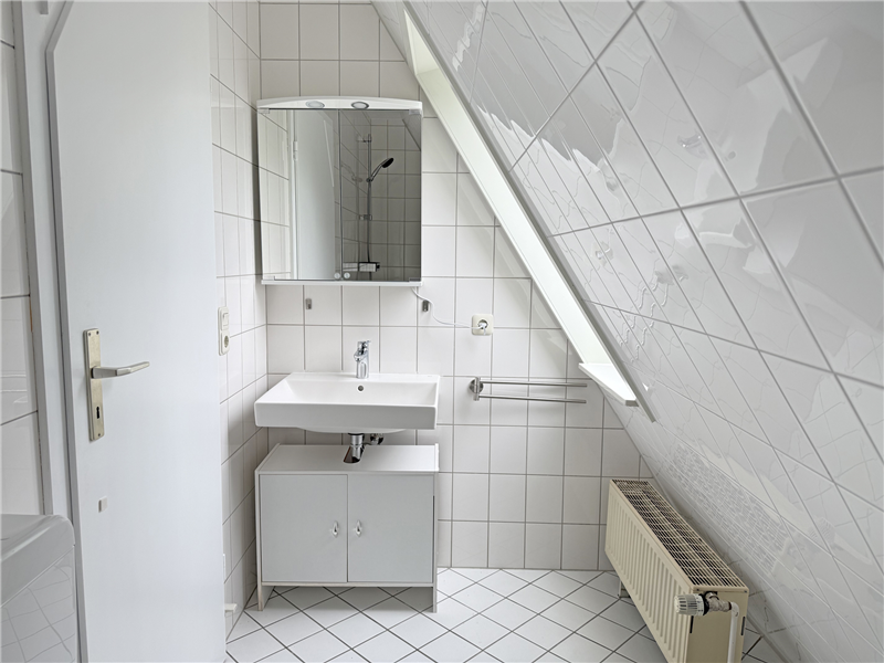 Vinylbelag in Holzoptik im Wohn- und Schlafbereich, Dachgeschoss mit neuem Teppichboden, Bäder mit Bodenfliesen. Wände und Decken neu weiß gestrichen.
