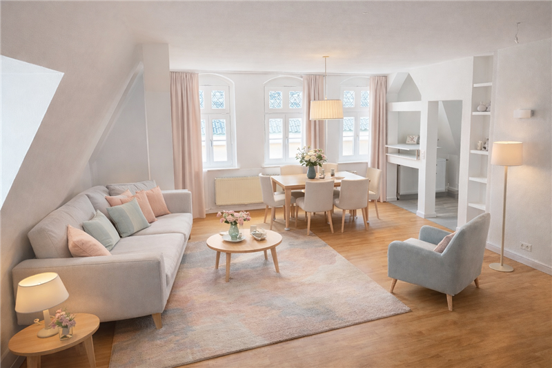 Alle Angaben erfolgen durch den Vermieter, für die Richtigkeit und Vollständigkeit übernehmen wir keine Haftung. Bei den Flächenangaben handelt es sich um ca. Angaben. Irrtümer und Auslassungen bleiben vorbehalten. Die möblierten dargestellten Bilder (Wohnzimmer, Schlafzimmer, Bad) sind digitale, KI-gestützte Visualisierungen. Sie dienen ausschließlich der beispielhaften Darstellung möglicher Einrichtungsideen und sind nicht verbindlich. Maßgeblich ist der tatsächliche Zustand der Immobilie vor Ort.